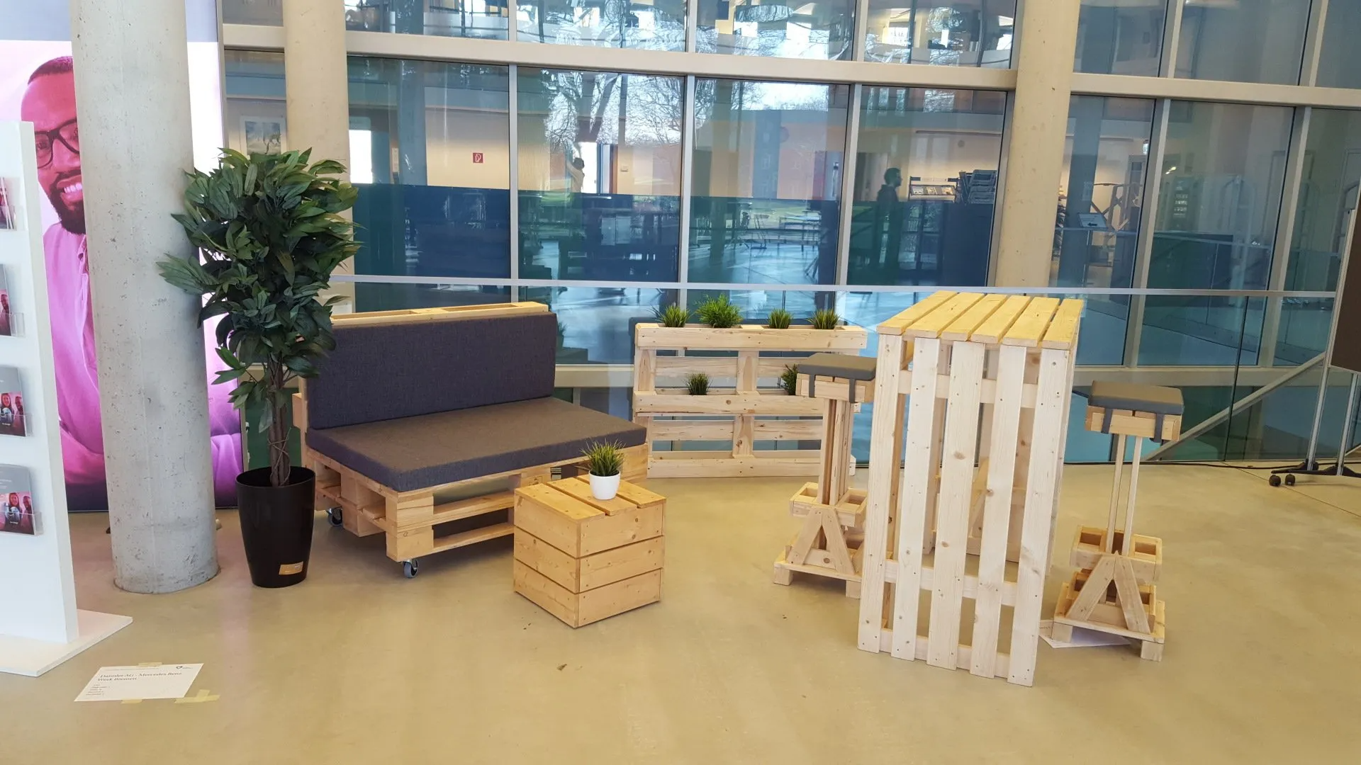 - 1x Beistelltisch, 1x Stehtisch, 2x Barhocker, 1x Palettenregal, 7x Gräser